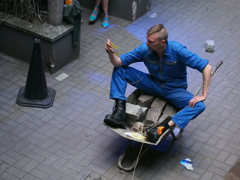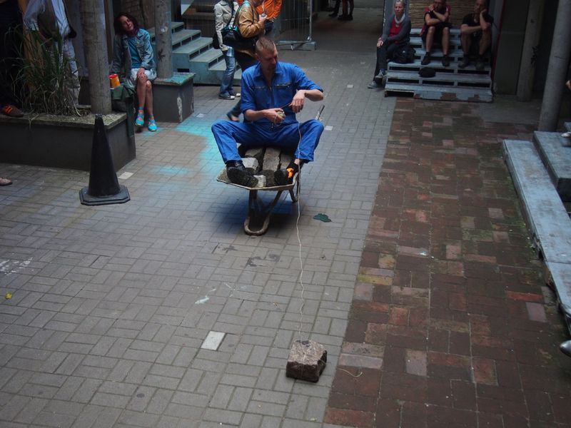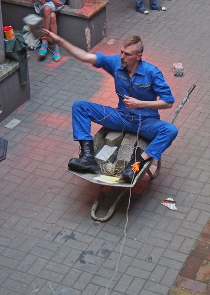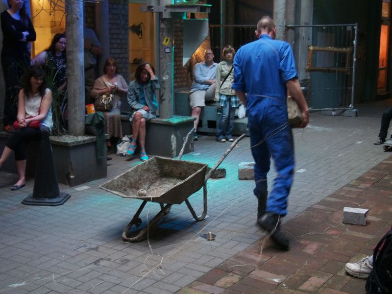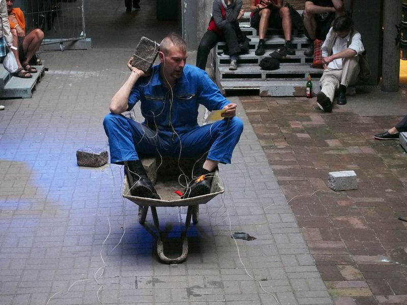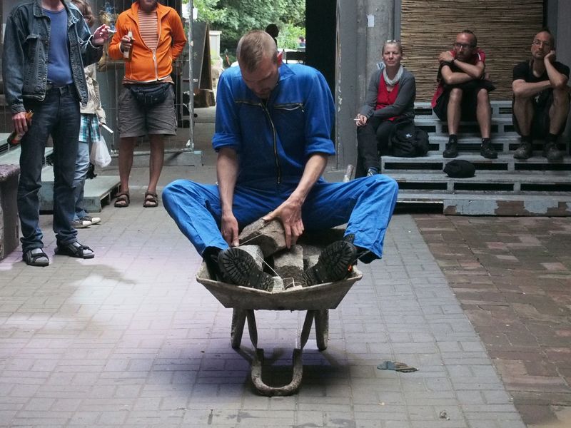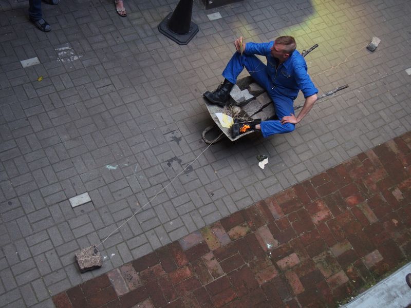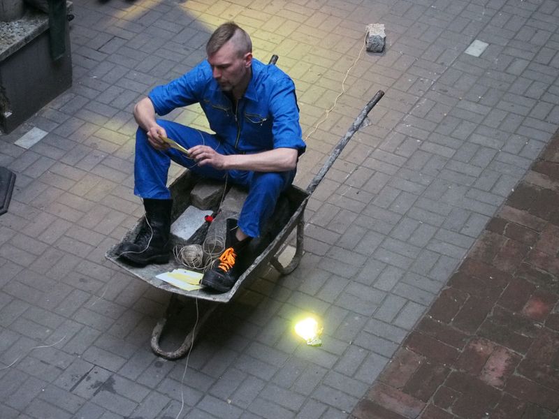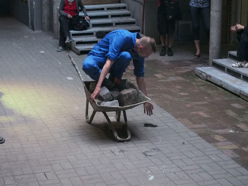 Ein mann tritt in der ferne auf, er wirft steine in eine karre, die kein rad mehr hat.