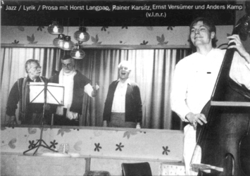 JAZZ/LYRIK/PROSA mit Horst Langpap, Rainer Karsitz, Ernst Versümer DIE KASSETTE von Carl Sternheim als Seidenschnur, JAZZLYRIKPROSA, Revue, als Faktotum & am Kontrabass, KÖNIGSKINDER von Georg Seidel als Prinz Peter, SCHICHT (UA) von Thilo Reffert als Herakles, Polizist, Pharmavertreter & Gitarre & RUMPELSTILZCHEN, nach den Gebrüdern Grimm als Piff in der Regie von Markus Dietze DER KAUKASISCHE KREIDEKREIS von Bertolt Brecht als Bauer, Adjutant & Jussup & DIE BREMER STADTMUSIKANTEN, nach den Gebrüdern Grimm, als Prinz Bleichenwang in der Regie von Goswin Moniac FAST FAUST von Albert Frank als Heiner (d.h. Gretchen, Mephisto, Wagner, Erdgeist & E-Gitarre) & DER MESSIAS von Patrick Barlowe als Bernhard (Jungfrau Maria, Herodes, Erzengel Gabriel, ... & Kontrabass) in der Regie von Albert Frank PETER PAN von Barrie/Kästner als der feine Starkey in der Regie von Birgit Eckenweber BEN LIEBT ANNA nach P.Härtling als Bernie, in der Regie von Andreas Steinke BYE BYE ANDREA DORIA, Revue von Uwe Bautz als werktätiger arbeitsloser Urlauber in der Regie von Olga Wildgruber FAMILIENGESCHICHTEN.BELGRAD von Bljana Srbljanovic als Andrija in der Regie von G. Weimann TRIUMPH DER LIEBE von P.C. de Marivaux als Prinz Agis in der Regie von K. Meyer - Freilicht-sommertheater |